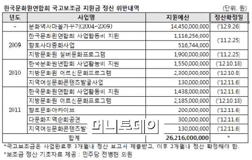 문화부는 문화원연합회에 2006년부터 지난해까지 지역문화 사업에 필요한 국고보조금을 400억 원 이상 지원했는데, 이 가운데 모두 12개 항목의 262억 원에 대해 보조금 정산을 방치하다 법에서 정한 시한을 넘겼다. 지원한 국고보조금 가운데 3분의 2에 해당하는 금액에 대해 규정대로 정산을 하지 않은 것이다.