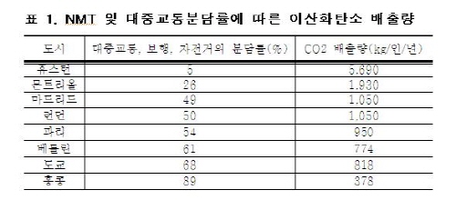 대중교통수단과 보행, 자전거의 분담률이 각각 61%와 68%에 이르는 베를린과 도쿄의 1인당 연간 CO2 배출량은 각각 774kg과 818kg이다. 반대로 이들 분담률이 각각 5%와 26%인 휴스턴과 몬트리올의 CO2배출량은 각각 5690kg, 1930kg이다. 휴스턴은 도쿄의 7배의 이산화탄소를 배출하고 있는 것이다. 결국 보행, 자전거, 대중교통수단은 연계되었을 때 가장 큰 효과를 볼 수 있다고 할 수 있다.