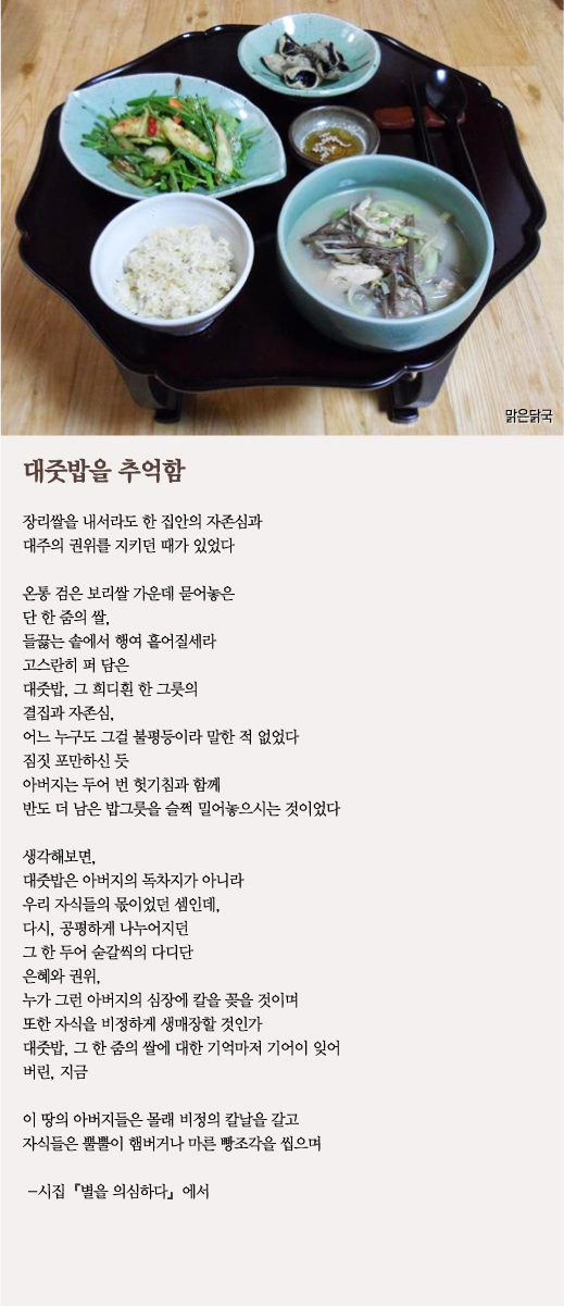 생전에 앙숙이었던 관계로 하관할 때 흙 한 줌 던지는 일도 허락받지 못한 나를 이룬 팔 할은 사실 바람이 아니라 아버지였으니……, 짐짓 핑계 삼아 맑은 닭국 한 그릇 올리는 저녁, 어디서 아버지의 헛기침 소리가 들리는 듯도 한데 말입니다.