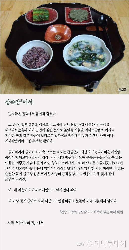 설치국이라고 들어보셨나요? 설치국은 남해에 와서 처음으로 경험한 음식 가운데 하나인데요, 제가 먹어본 건 홍합을 삶아 식힌 국물에 청각, 홍합건더기, 양파, 청양고추 따위를 깨소금, 식초, 매실청, 다진 마늘로 조물조물 양념하여 넣고 얼음을 동동 띄워낸......, 그래도 쉬 감이 안 잡히시면, 으음......, 여름철에 농촌에서 흔히 해먹는 오이냉국 같은 거라고나 할까요. 암튼 해장국으로는 그만인데요, 재료는 조리하는 사람마다 조금씩 다르더라고요. “제가 먹어본 건”이라고 한 건 그런 까닭에서고요.