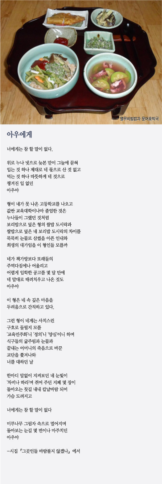 [편집자주] "그래도 세상과 사람에 대한 믿음과 애정을 버리지 말게 해 달라(오인태 시인의 페이스북 담벼락 글 재인용)'. 얼굴 모르는 친구들에게 매일 밥상을 차려주는 사람이있다. 그는 교사이고 아동문학가이고 시인이다. 그는 본인이 먹는 밥상의 사진과 시, 그리고 그에 대한 단상을 페이스북에 올려 공유하고 있다. 시와 밥상. 얼핏 보면 이들은 어울리지 않는 조합일 수 있지만 오인태 시인에겐 크게 다르지 않다. 밥을 함께 먹는다는 것은 더불어 삶을 산다는 것. 시 역시 때론 각박하고 따뜻한 우리 삶 우리 이야기다. 시와 함께 하는 '밥상 인문학'이 가능한 이유다. 머니투데이 독자들께도 주 3회 오인태 시인이 차린 밥상을 드린다. 밥상을 마주하고 시를 읽으면서 정치와 경제를 들여다보자. 모두 사람 사는 이야기니 어려울 게 없다.