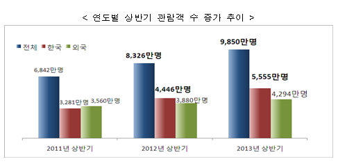문화체육관광부는 영화진흥위원회 통합전산망 집계에 따라 올 상반기 한국 영화산업을 결산한 결과, 한국영화 관객이 5555만명으로 지난해 같은 기간보다 25%(1109만명) 증가하며 사상 처음으로 5천만 명을 돌파했다고 2일 밝혔다.