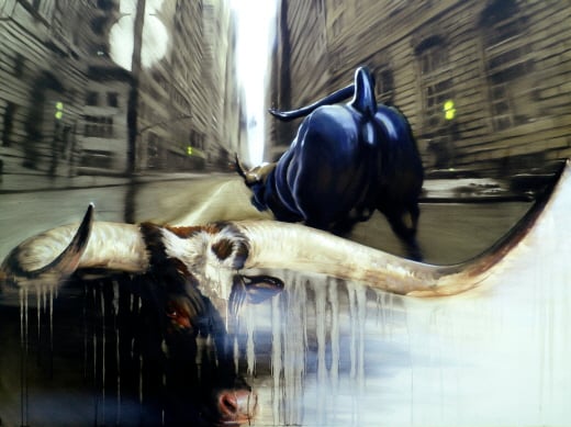 용맹스러운 동물과 세계경제의 중심인 월가의 모습을 한 폭에 담은 작업으로 서울 종로구 소격동 옵시스 아트 화랑에서 국내 첫 개인전 '오만과 편견'(Arrogance & Prejudice)을 열고 있는 서양화가 구본정(41).