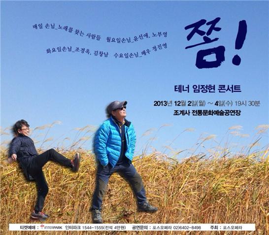 ◇테너 임정현 콘서트 '쫌'=12월 2~4일 오후 7시30분. 조계사 전통문화예술공연장. 전석 4만원. 예매·문의 인터파크 1544-1555, 포스오페라 (02)6402-8498.