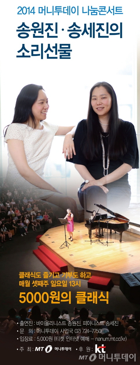오는 16일(일) 오후 1시, 서울 KT 광화문지사 1층 올레스퀘어 드림홀에서 아름다운 클래식음악 선율과 함께 힐링의 시간을 보내면 어떨까. 입장료는 커피 한 잔 값에 해당하는 5000원. 입장 연령을 제한하지 않아 어린 자녀들도 즐길 수 있으니 교육적으로도 좋은 기회다. 바로 머니투데이와 함께하는 '송원진·송세진의 소리선물' 나눔음악회에서다.