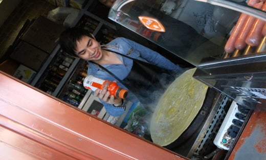전병을 파는 가게는 주로 지하철역 앞, 시장 등 길거리에서 만날 수 있다. 가격도 4위엔(약 700원) 정도로 무척 저렴하다.