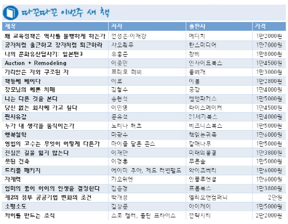 그밖에 유홍준 교수의'나의 문화유산답사기: 일본편3'이 나왔고,'누가 내 생각을 움직이는가','나는 다른 것을 본다','가라않은 자와 구조된 자'등도 이번 주 새 책이다.