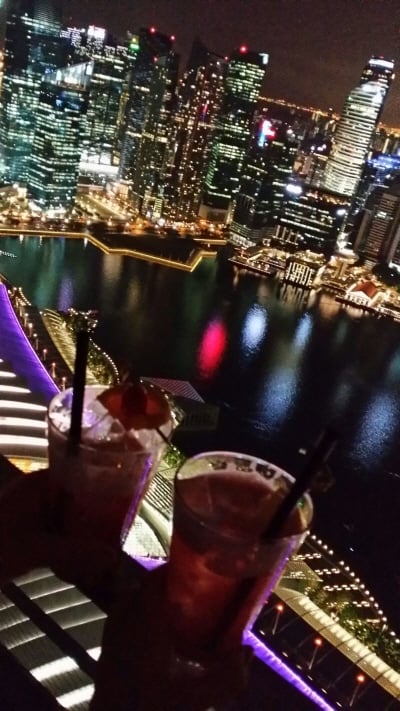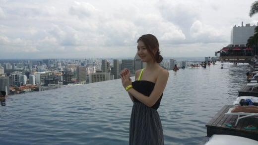 저도 싱가포르 도심 전경을 바라보며 멋진 사진을 남겼습니다. 이곳을 사진으로만 볼 때는 꼭대기라서 떨어지면 어쩌지, 무서우면 어쩌지 걱정을 했었지만요. 굉장히 안전하게 시설이 잘 되어 있었습니다. 이중으로 된 수영장 난간이라 걱정은 붙들어 매셔도 됩니다.