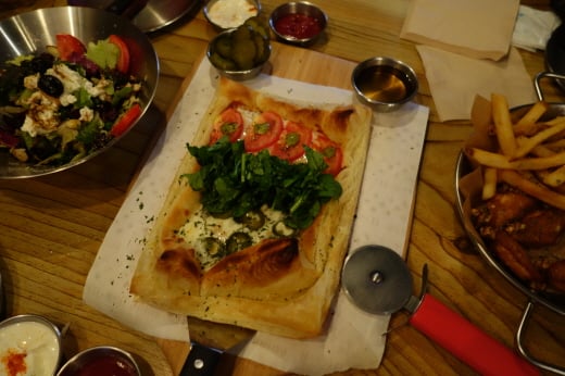 이런 안주들 중에서도 제가 가장 백미로 꼽는 건 '욱파이'입니다. 이름에서 느껴지듯 욱바 사장님께서 직접 개발한 안주인데요. 안주라고 부르기엔 너무 사치스러울 정도입니다. 한 겹 한 겹 정성스레 페이스트리 반죽을 빚어내 그 위에 신선한 치즈와 직접 재배한 시금치를 얹었습니다. 다른 레스토랑에서 본받을 만한 페이스트리 피자였습니다.