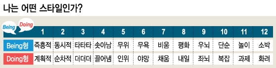 위의 것에 많이 쏠리면 'Being형'이다. 아래 것에 많이 쏠리면 'Doing형'이다. 위의 것을 꼽은 숫자를 12로 나눈 비율을 나의 '존재 비율'이라고 하자. 이 비율이 50% 아래면 나는 내 존재의 뿌리에서 많이 멀어진 것이다.