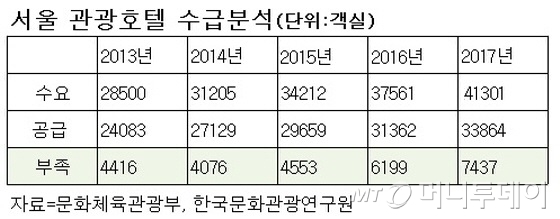 이에 대해 한국관광공사 관계자는 "해외 여행사들을 조사한 결과 골든위크와 춘절·국경절 같은 성수기에 숙박예약이 힘들어 한국 여행을 포기한 수요가 실제 여행을 온 수요의 40%에 달한다"며 "홍콩이나 도쿄, 상하이 등과 비교해도 서울 호텔 객실수는 절반 수준도 되지 않는다"고 밝혔다.