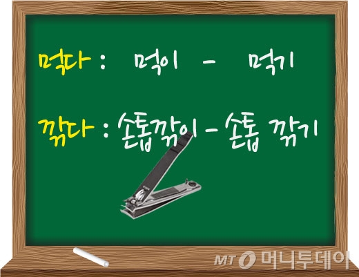 '깎다'의 경우 ㄲ 받침까지는 잘 찾았는데 '깎이', '깎기' 중 하나를 골라야 할 때 헷갈리기도 합니다. 그림에서 보듯이 먹는 대상이 '먹이', 먹는 행동이 '먹기'인 것처럼 손톱을 깎는 도구는 손톱'깎이', 깎는 행동은 '깎기'가 맞습니다.