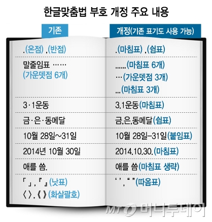 제가 초등학교(정확히 '국민학교')에 다닐 때만 해도 '.'과 ','는 '마침표'와 '쉼표'였는데요. 1988년 초 '한글맞춤법' 규정이 제정돼 1989년 3월부터 명칭이 '온점' '반점'으로 바뀌었습니다. 그러던 것을 26년 만에 다시 '마침표'와 '쉼표'라 개정한 것입니다. 단 기존 '온점'과 '반점'이라는 용어도 쓸 수 있도록 허용했네요.