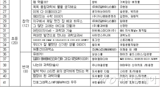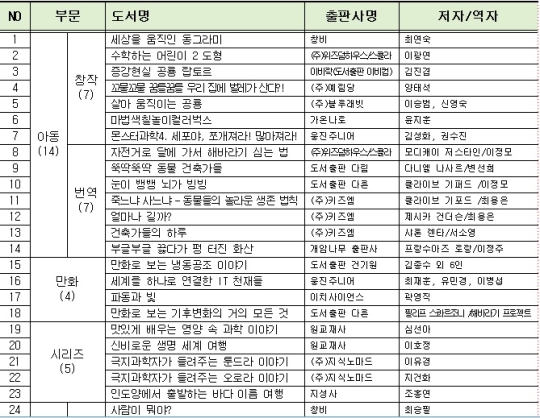이 사업은 국내에서 발간된 과학도서 중 읽기 쉽고 유익한 도서를 선정·지원하는 것으로 지난 1999년부터 매년 시행해오고 있다.