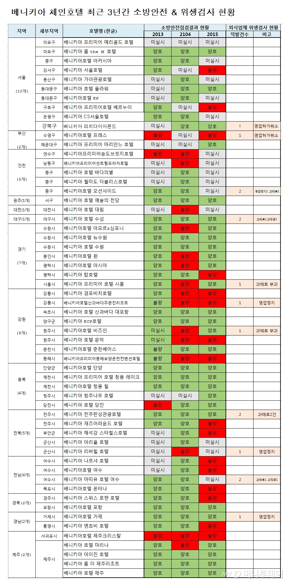 특히 지난 3년간 절반에 가까운 호텔들이 1번 이상은 소방안전 불량판정을 받았고, 2회는 4곳, 3년 내내 불량으로 판정받은 호텔도 3곳이 있었다.