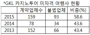 또 "GKL과 계약을 체결한 미자격 여행사가 2013년 66개에서 2014년 93개로 27개나 증가했다"며 "불법 여행사가 차지하는 비중도 2013년 43.4%에서 2015년 58.5%로 15%포인트나 높아졌다"고 비판했다.