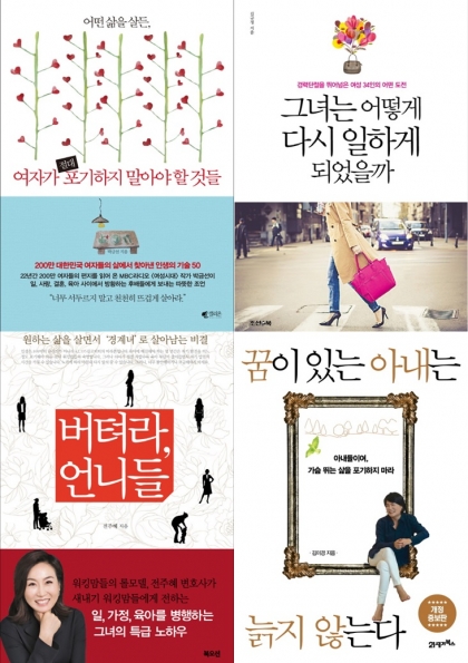 최근 일과 양육을 동시에 해야 하는 '워킹맘'이나 '경력단절여성'(경단녀)이 늘어나는 현상 역시 책에도 고스란히 나타난다. 불과 몇 년전만 해도 직장 혹은 사회에서 여성들이 살아남는 법, 현명하게 사랑하고 결혼하는 법, 여성들을 위한 재테크 등의 책이 주목을 받던 것과는 사뭇 다른 흐름이다.