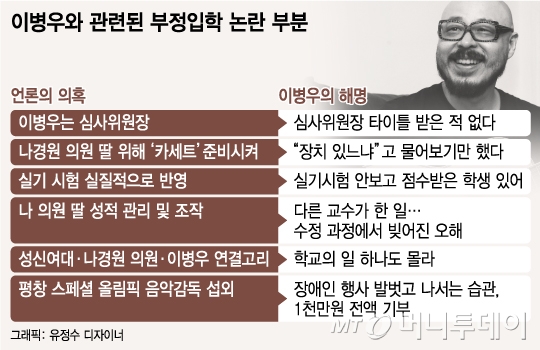 이듬해 2013년 나 의원이 위원장으로 있는 '평창 동계 스페셜 올림픽'에서 이병우가 음악 감독으로 초빙된 것도 의혹 연결 고리에 안성맞춤인 재료로 쓰였다. 하나의 그림으로 보면 나 의원과 성신여대는 '특별한 관계'처럼 보이고, 이병우와 나 의원 사이도 그럴듯한 친밀 관계를 유지하는 것처럼 보인다. 하지만, 학교와 자신을 한 몸으로 보고 나 의원과의 관계를 조망하는 것 자체가 어불성설이며 이는 분명 '다른 것'이라는 게 이병우의 설명이다.