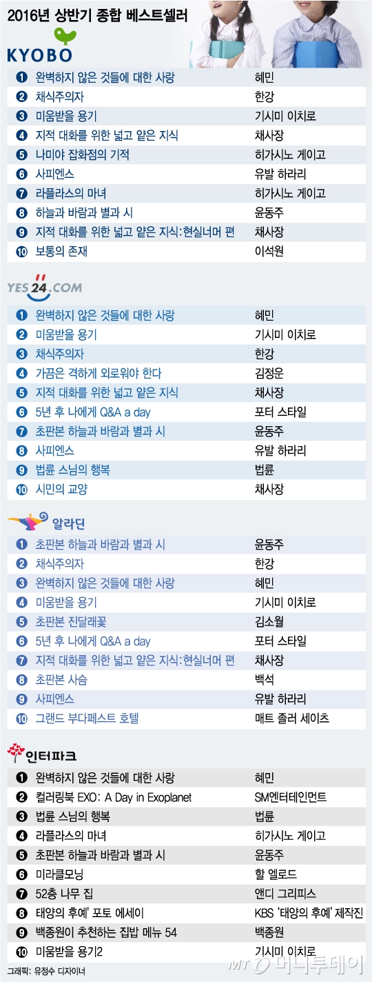 올해 상반기 가장 잘 팔린 책은 혜민스님의 ‘완벽하지 않은 것들에 대한 사랑’이다. 2월 출간과 동시에 베스트셀러에 이름을 올린 이 책은 알라딘(3위)을 제외하고 교보문고, 예스24, 인터파크에서 모두 상반기 종합 베스트셀러 1위를 차지했다.