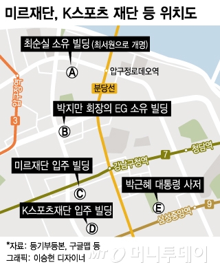 미르 사무실은 정관 및 회의록 등이 유사해 ‘쌍둥이 재단’ 의혹을 받는 K스포츠재단과 직선거리로 약 450 m 떨어진 곳에 위치해 있다. 공교롭게도 박 대통령 삼성동 사저와 1 km, 대통령 동생인 박지만 회장의 EG 논현동 빌딩과 800 m 거리다. 일각에서 ‘비선 실세’ 의혹을 제기하는 최순실(최서원으로 개명) 소유 빌딩과 1.5 km 떨어져 있다. 최순실은 미르·K스포츠 재단 운영에 관여했다는 의혹과 함께 정권 유착설이 제기된 당사자다.