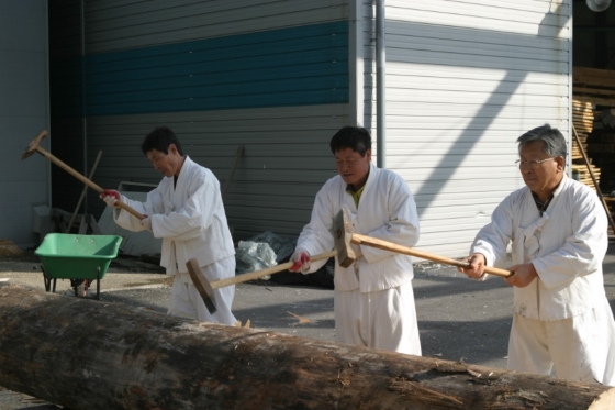 두 팔을 활짝 벌려 껴안아도 한참이 모자란 두꺼운 통나무의 표면을 가다듬고 모난 부분을 잘라내는 작업이 한창이었다. 이달 초 찾은 경기 남양주시의 대목장 전수관, 최기영(71) 대목장과 그와 함께 작업하고 있는 대목수들의 움직임은 분주했다.