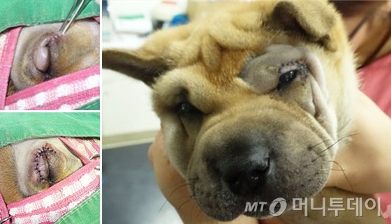 강아지는 상태가 별로 좋지 않았다. 샤페이는 얼굴뿐 아니라 온몸에 주름이 많은 강아지이다. 이 아이는 한쪽 안검(눈꺼풀. *사람의 눈꺼풀처짐 증상을 안검하수라고도 합니다)이 잘못 형성돼 거의 눈을 덮고 있었다. 속눈썹은 안구를 찔러 결막염이 심했고, 안구충혈과 눈물도 심했다.