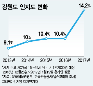 올림픽이 열리는 강원도 인지도는 2013년 9.1%에서 4년 만에 14.2%로 껑충 뛰었다. 2016년(10.4%)대비 3.8%포인트 증가했다. 이는 16개 도시 중 가장 높은 상승세다. 공사 측은 올림픽을 계기로 올림픽 홍보 마케팅이 긍정적인 효과를 냈다고 분석했다.