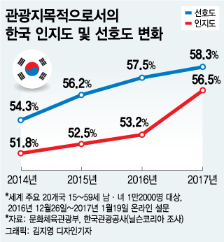 관광공사 측은 "한국관광 인지도는 2012년 조사 때부터 매년 평균 0.6%포인트 상승했는데 지난해 특히 큰 폭으로 늘었다"며 "평창올림픽 개최에 따른 전방위적 홍보활동 영향 때문"이라고 설명했다. 선호도도 2016년 57.5% 대비 0.8%포인트 상승한 58.3%를 기록했다.