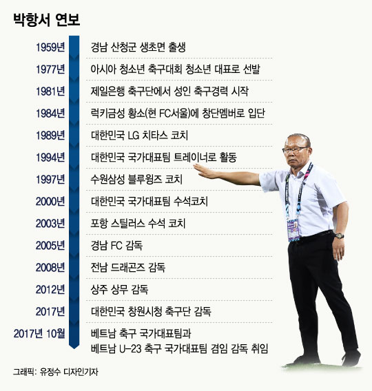 길지 않은 프로선수 생활을 마친 뒤 지도자 생활을 시작했고 꽃을 피운 것은 2002년 한일 월드컵에서 명장 히딩크를 수석코치로 보좌하면서다. 쌀딩크라는 별명도 히딩크와의 인연을 빼놓고서는 생각할 수 없다. 프로팀과 지역 아마팀을 이끌며 몇차례 우승 트로피를 들어올렸지만 2002년만큼의 영광은 찾아오지 않았다. 지도자 생활을 접을 수도 있을 때 베트남쪽에서 국가대표 감독 제의가 들어왔고 그는 이내 수락했다. 다시 한번 승부와 축구 변방 베트남을 끌어올리는데 온몸을 바치겠다는 각오가 있었던 것. 가정에서 아버지가 가족들의 변함없는 울타리가 돼 주듯 박항서는 꺾이지 않았다.