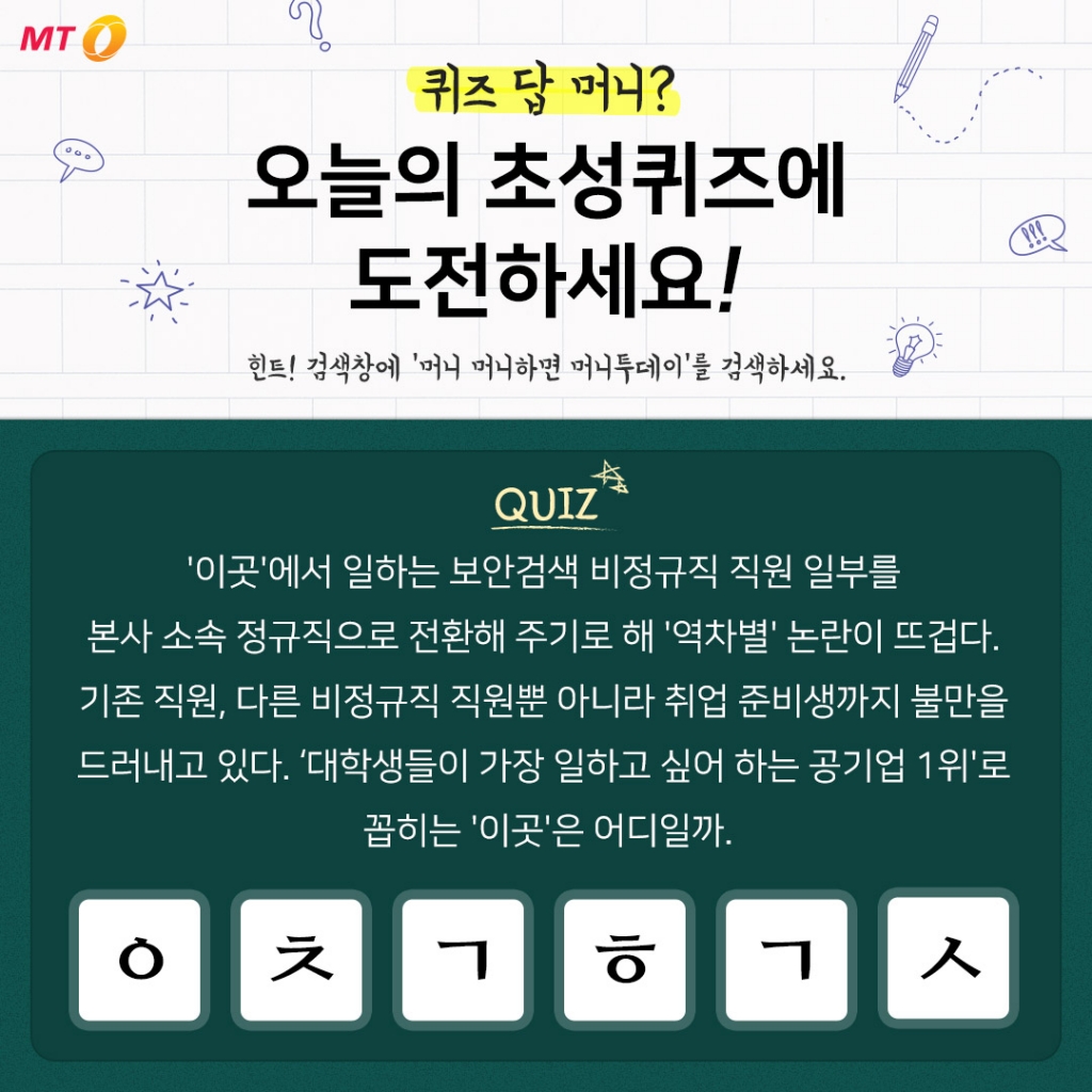28일 머니투데이가 낸 31회 초성퀴즈 문제는 "'이곳'에서 일하는 보안검색 비정규직 직원 일부를 본사 소속 정규직으로 전환해 주기로 해 '역차별' 논란이 뜨겁다. 기존 직원, 다른 비정규직 직원뿐 아니라 취업 준비생까지 불만을 드러내고 있다. '대학생들이 가장 일하고 싶어 하는 공기업 1위'로 꼽히는 '이곳'은 어디일까."이다.