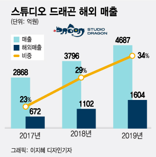 스튜디오드래곤의 해외매출 자료를 보면 2017년 매출 2868억원 중 해외매출은 672억원(23%)이지만, 2019년엔 매출 4687억원 중 해외매출이 1604억원(34%)으로 비중이 10% 이상 높아졌다.
