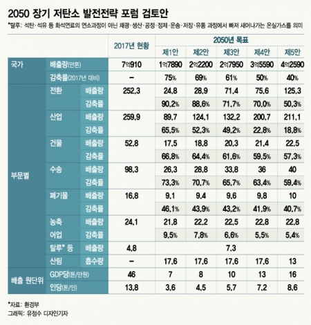 한국환경정책평가연구원(KEI)도 지난 6월 내놓은 '2050 저탄소 사회 비전 포럼 검토안 주요 내용' 보고서에서 선진국에 비하면 미흡하다는 평가를 내놨다. 보고서는 "모든 안이 2017년 기준으로 보면 상당히 적극적인 감축안"이라면서도 "2030년 후 인구당 배출량 및 국내총생산(GDP) 당 배출량 개선 속도는 선진국 대비 늦다"고 지적했다.