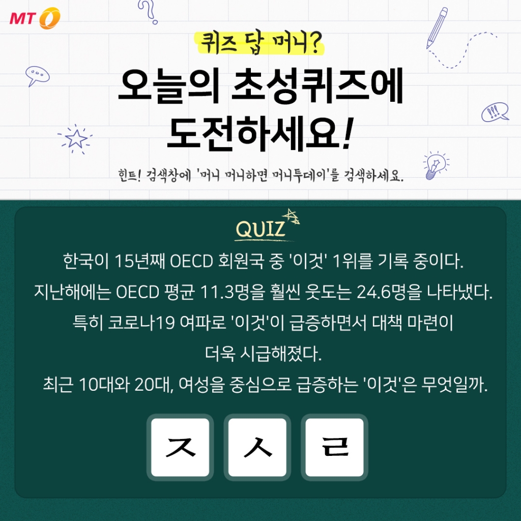 8일 머니투데이가 낸 50회 초성퀴즈 문제는 "한국이 15년째 OECD 회원국 중 '이것' 1위를 기록 중이다. 지난해에는 OECD 평균 11.3명을 훨씬 웃도는 24.6명을 나타냈다. 특히 코로나19 여파로 '이것'이 급증하면서 대책 마련이 더욱 시급해졌다. 최근 10대와 20대, 여성을 중심으로 급증하는 '이것'은 무엇일까."이다.