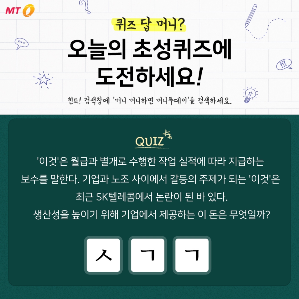 13일 머니투데이가 낸 64회 초성퀴즈 문제는 "'이것'은 월급과 별개로 수행한 작업 실적에 따라 지급하는 보수를 말한다. 기업과 노조 사이에서 갈등의 주제가 되는 '이것'은 최근 SK텔레콤에서 논란이 된 바 있다. 생산성을 높이기 위해 기업에서 제공하는 이 돈은 무엇일까?"이다.