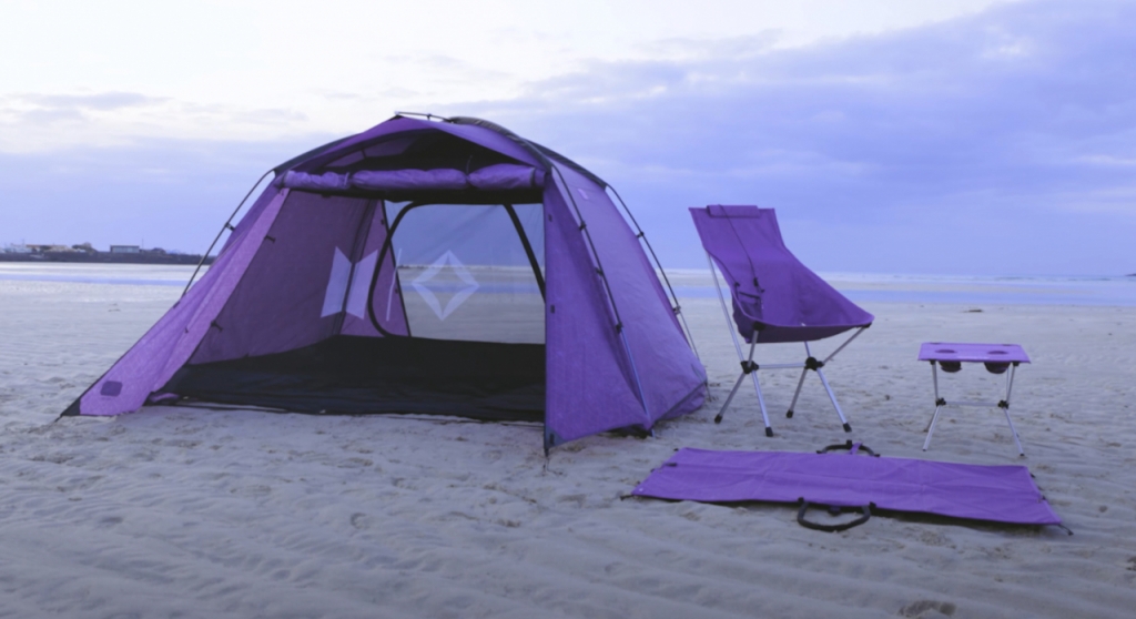 이번 컬렉션은 텐트 아이템까지 추가되어 총 7종의 상품으로 구성됐다. 텐트, 체어, 테이블, 폴딩 토트, 비치타월, 에어 폼 헤드레스트, 아이디케이스가 준비됐으며, 원단의 퍼플 컬러와 특수 열처리 프린트 방식으로 만든 패턴은 고스란히 유지됐다.