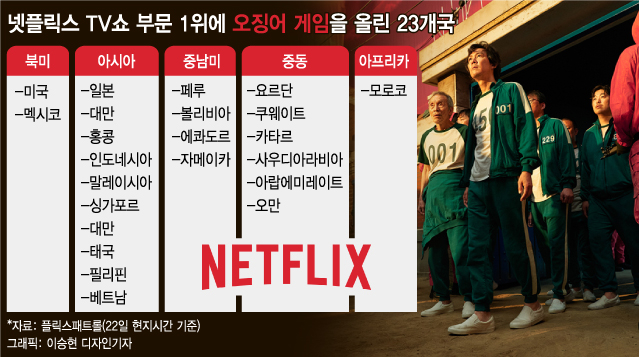 국내에서 제작한 드라마 '오징어게임'이 세계 최대 온라인 동영상 서비스업체(OTT) 넷플릭스가 서비스하는 23개국에서 지난 22일(현지시간) 1위를 차지했다.