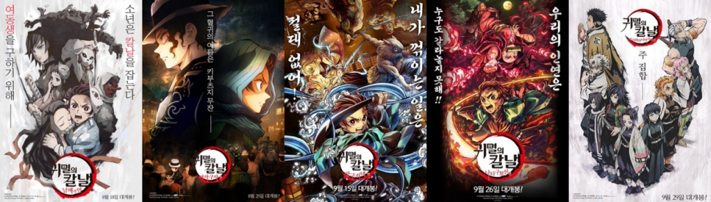 8월 18일 '귀멸의 칼날: 남매의 연'을 시작으로, 25일 '귀멸의 칼날: 아사쿠사 편', 9월 15일 '귀멸의 칼날: 장구저택 편', 9월 26일 '귀멸의 칼날: 나타구모산 편', 9월 29일 '귀멸의 칼날: 주합회의?나비저택 편'을 만나볼 수 있다.
