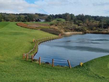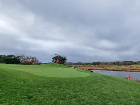 노란 페널티 구역은 일반적인 워터해저드를 의미한다. 해저드로 경계선을 넘어간 지점과 홀을 연결하는 후방선상에 드롭, 1벌타를 부여받고 치면 된다.
