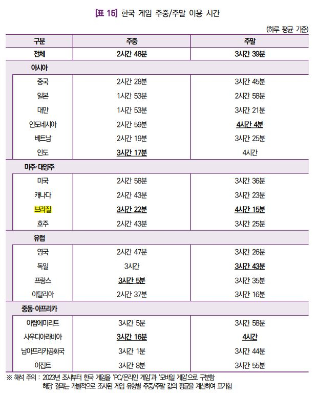 문화체육관광부와 한국콘텐츠진흥원이 8일 발간한 한국 게임에 대한 해외 게임 이용자들의 인식과 이용 실태를 정리한 '2023 해외 시장의 한국 게임 이용자 조사' 보고서에 따르면 K-게임의 하루 평균 이용 시간을 권역별로 비교해본 결과, 주중과 주말 모두 브라질에서 상대적으로 높게 나왔다. 주중은 브라질(3시간 39분), 프랑스·사우디아라비아(각각 3시간 26분), 인도(3시간 19분) 순으로 집계됐다. 주말은 브라질(4시간 39분), 인도네시아(4시간 13분), 아랍에미리트(4시간 10분), 독일(4시간 4분) 순이었다.