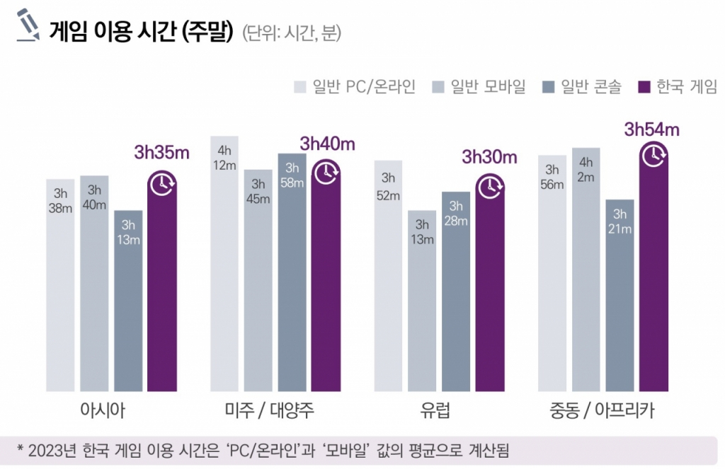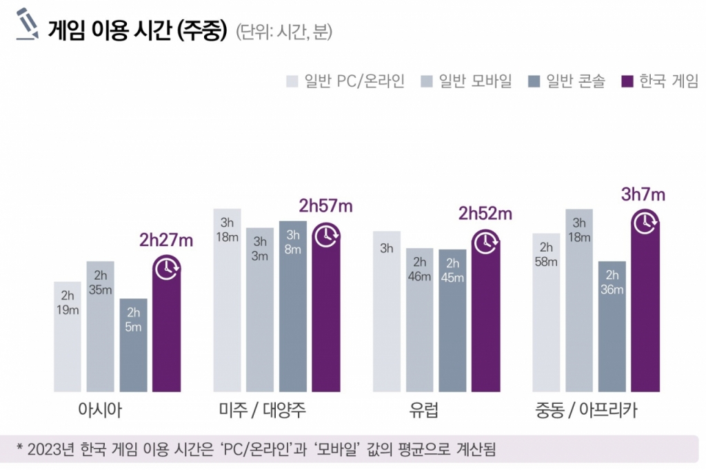 특히 전년 대비 주중과 주말 모두 한국 게임 평균 이용 시간이 유의미하게 증가한게 눈에 띄었다. PC·온라인 게임은 브라질이 주중(3시간 39분)과 주말(4시간 39분) 모두 이용 시간이 가장 길었다. 모바일 게임은 주중 기준으로 인도(3시간 21분), 브라질·사우디아라비아(3시간 14분) 순이었다. 주말의 경우 인도(4시간 3분), 인도네시아(4시간 2분), 브라질(4시간), 사우디아라비아(3시간 59분) 순으로 이용 시간이 길었다.