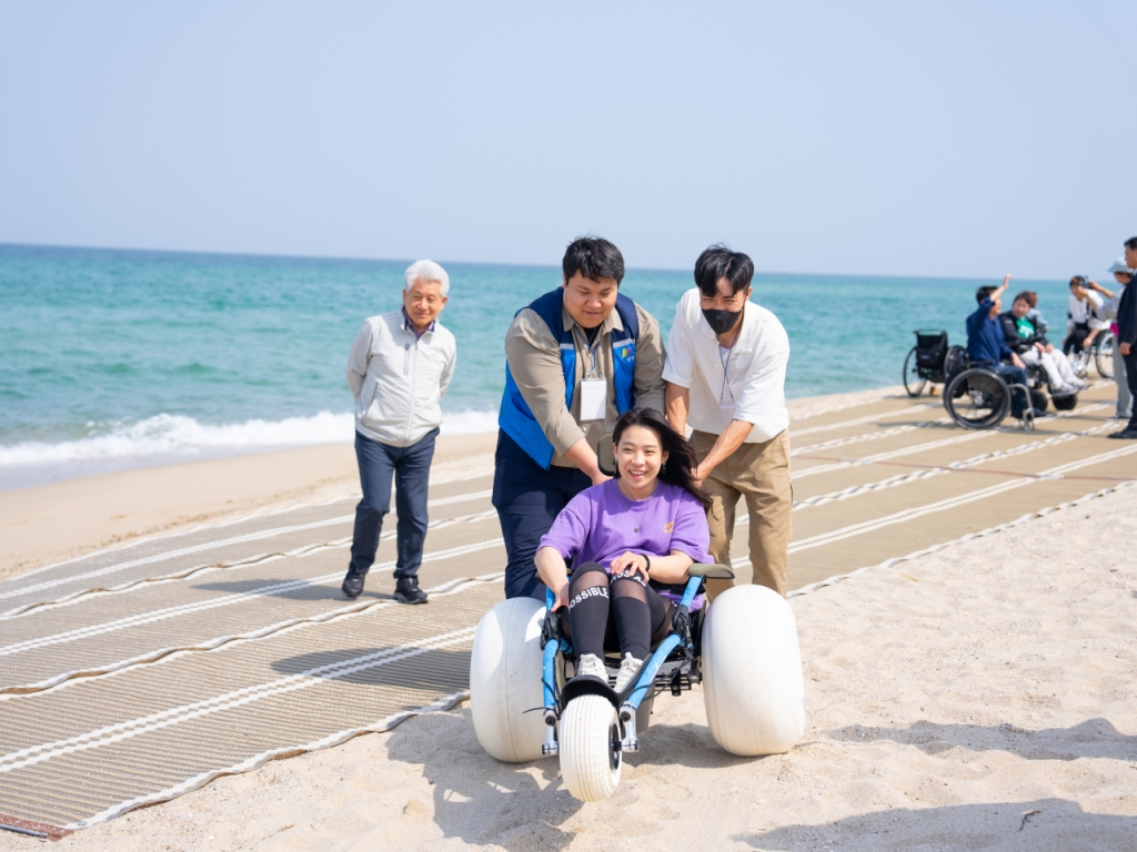 장 차관은 휠체어가 오갈수 있도록 모래사장에 깔린 특수매트를 확인하고 준비된 수상 휠체어도 함께 타 보는 등 장애가 있는 참가자들의 입장을 이해하기위해 연곡해변에서의 무장애 관광을 직접 경험했다.
