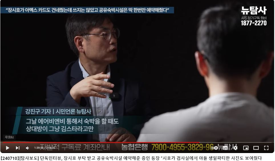 15일 머니투데이 취재에 따르면 해당 영상은 뉴탐사가 5월 초 국정농단 사건 뒷거래 의혹 당사자로 지목했던 김영철 서울북부지검 차장검사가 장씨와 2020년 8월 19일 서울 삼성동의 한 공유숙박업소에서 밀회를 가졌다고 주장했던 내용에 대해 새롭게 익명 제보자 인터뷰를 통해 뉴탐사의 주장을 보완하는 내용이다.