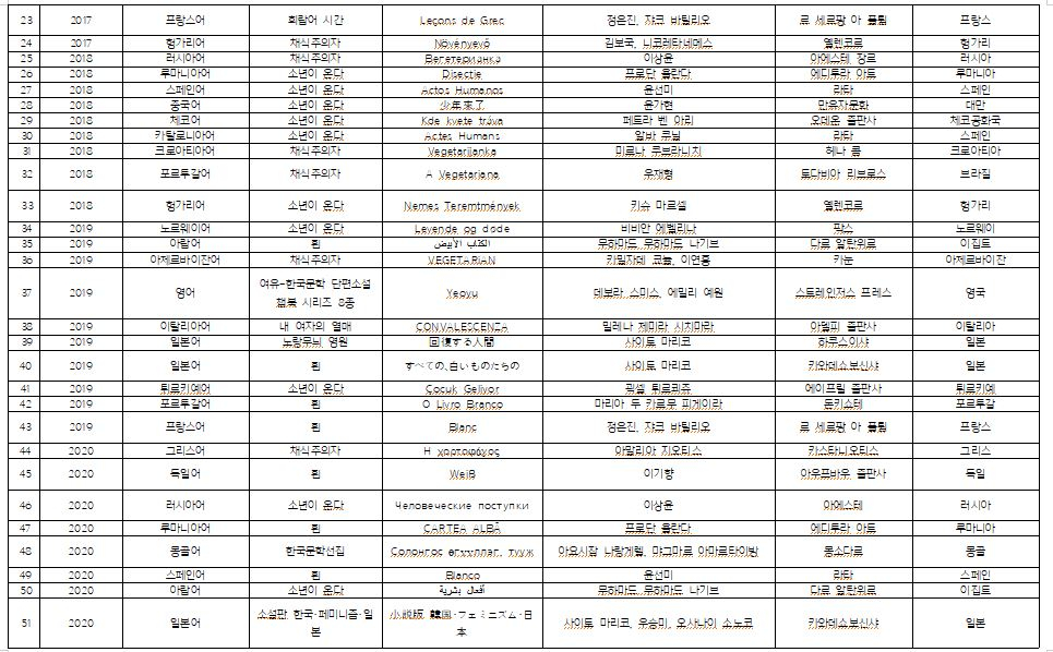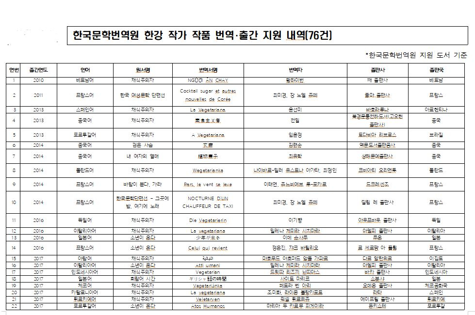 한강의 작품들은 이미 문체부 산하 한국문학번역원에 의해 28개국 언어로 76건 번역·출판돼 있다.