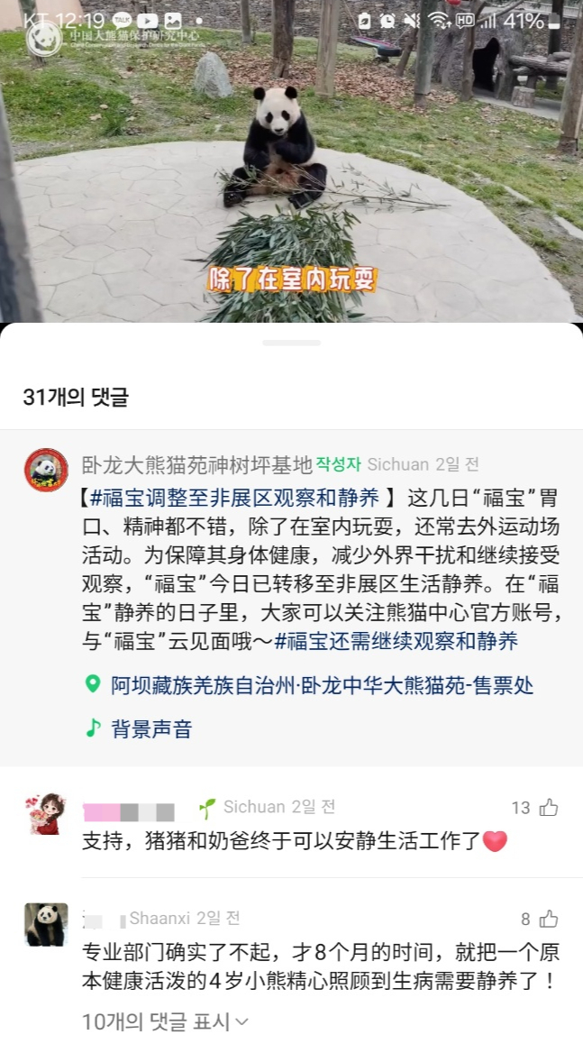 이에 앞서 오후 2시 7분에는 같은 위챗 계정의 '채널' 포스팅을 통해 '푸바오'에 대해서만 별도 소식을 전하면서 "건강을 보호하고, 외부 간섭을 줄이고 지속적인 관찰을 위해 오늘(31일) 비전시구역으로 이동하여 휴식을 취하고 있다"고 밝혔다. 그러면서도 푸바오의 1일 이후 공개여부에 대해선 명확히 언급하지 않았다.