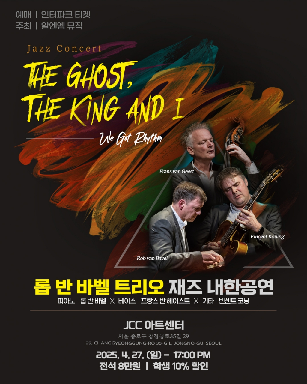 네덜란드 출신 재즈 트리오 '더 고스트, 더 킹 앤 아이'(The Ghost, the King I)'는 드럼이 없이 피아노, 베이스, 기타로 구성된 것이 특징이다. 오스카 피터슨, 아트 테이텀, 냇킹콜 트리오의 영향을 받은 이들의 음악은 전통과 현대를 아우르는 연주로 깊고 굵은 무대를 선보일 것으로 기대된다.