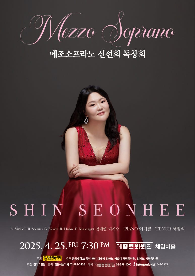 풍부한 표현력과 화려한 음색으로 감동의 무대를 선사하는 메조소프라노 신선희가 4월 25일 세종문화회관 체임버홀에서 독창회를 개최한다.