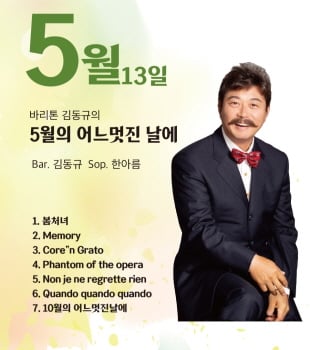 관객과 함께 호흡하는 성악가로 대중에게 알려진 국민 성악가 바리톤 김동규의 공연이 펼쳐진다. 성악은 물론 대중가요로 공연을 구성해 관객들에게 ‘5월의 어느 멋진 날’을 선물할 예정이다.