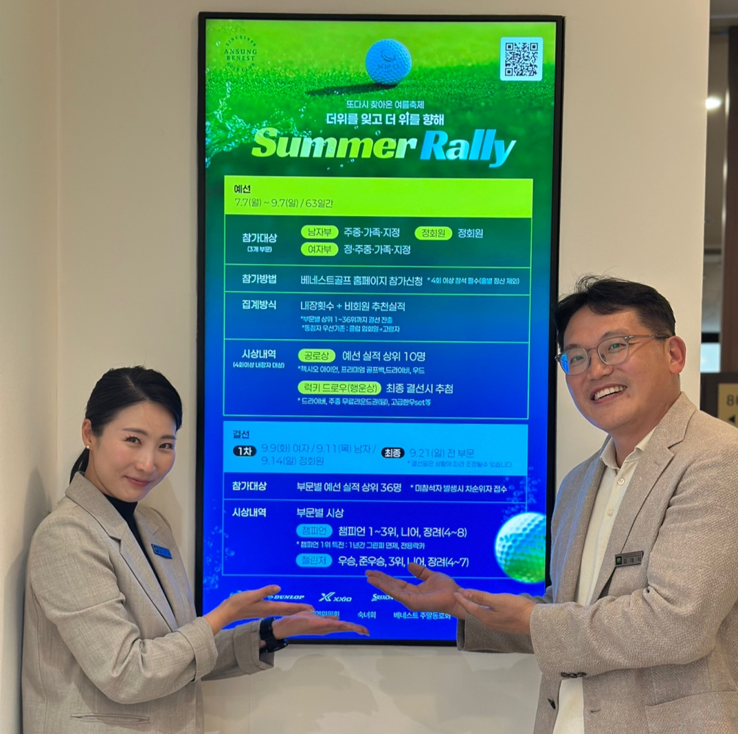 각 골프장별 특색을 살린 여름시즌 특별 이벤트도 다채롭다. 안성베네스트GC는 클럽 회원을 대상으로 펼쳐지는 이벤트 '썸머 랠리 골프대회'를 개최한다. 오는 9월7일까지 두 달간 예선전이 진행되며, 같은달 9일부터 21일까지는 챔피언(스트로크)과 챌린저(신페리오) 결선 대회가 진행될 예정이다. 이번 이벤트에서는 그린피 면제 쿠폰, 최신형 드라이버, 고급 보스턴백 등 푸짐한 선물을 증정한다.