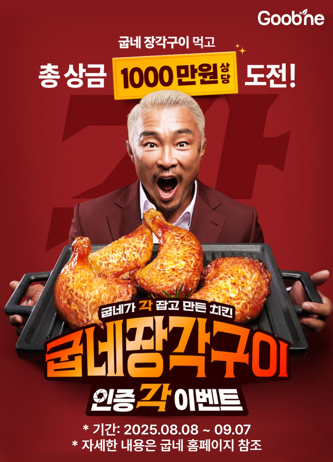 경품은 1등 굽네치킨 제품 교환권 300만 원(3만 원권 100장)을 비롯해, 부문별 1등 아이패드 에어 13, 2등 프라이빗 풀빌라 청풍813 이용권, 3등 굽네 장각구이+피자 세트 기프티콘 등 총상금 1천만 원 규모다.