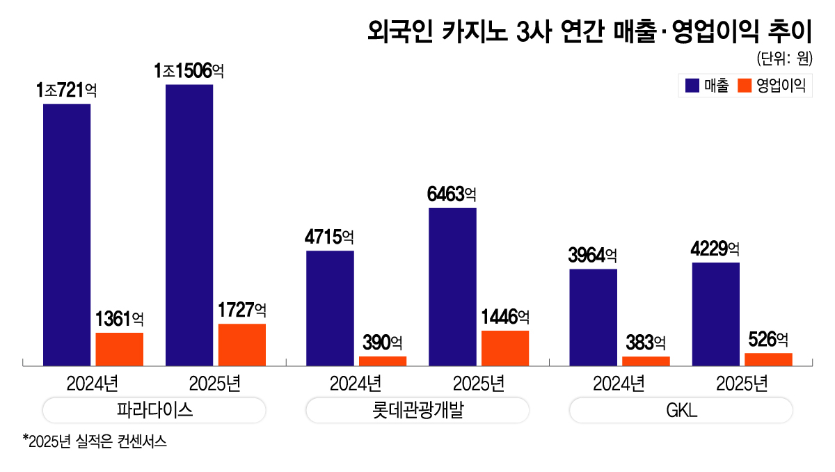 이 같은 업계 전반의 성장은 K팝, K드라마 등 한류 콘텐츠의 글로벌 인기와 항공 노선 정상화, 단체 관광 재개 등의 외부 요인이 맞물린 결과로 풀이된다. 올해도 실적 호조세가 이어지며 3사의 실적은 더욱 개선 것으로 전망된다. 파라다이스와 롯데관광개발의 연간 영업이익은 각각 2000억원을 돌파하고, 3사 합산 영업이익은 올해 5000억원에 달할 것으로 예상된다.